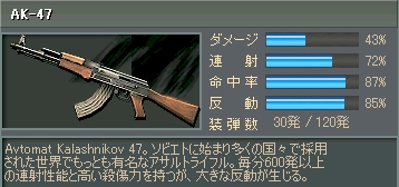 AKよりも連射が速く反動が低い銃。合計の弾数はAKと変わらないが、装弾数が5発少ないため使ってて弾が少なく感じる。しかしこの反動でこの連射力は1つの魅力といえるだろう。 |